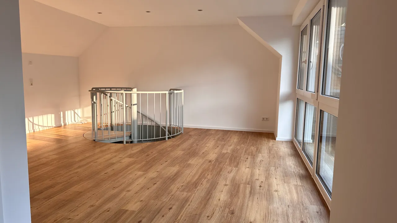 Über die Wendeltreppe erreichen Sie das offen gestaltete Schlafzimmer mit großer Fensterfront, sowie ein weiteres Zimmer, dass sich als Homeoffice, Ankleide oder Kinderzimmer eignet. Außerdem das hochwertig ausgestattete Bad - ein perfekter Rückzugsort nach einem langen Tag.